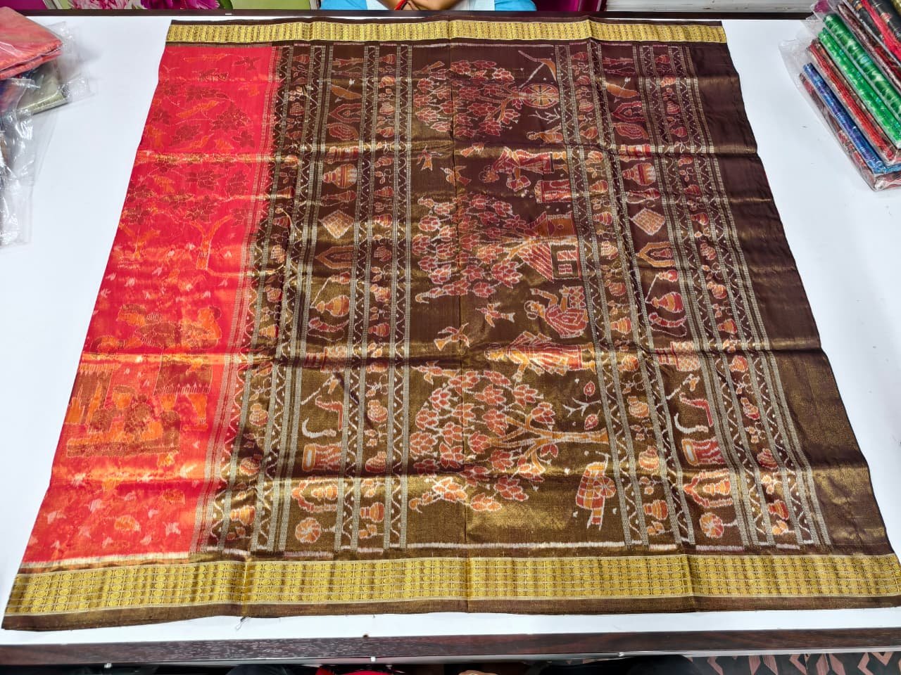 🌺 Traditional Handloom Silk Saree – Brown & Red with Golden Border