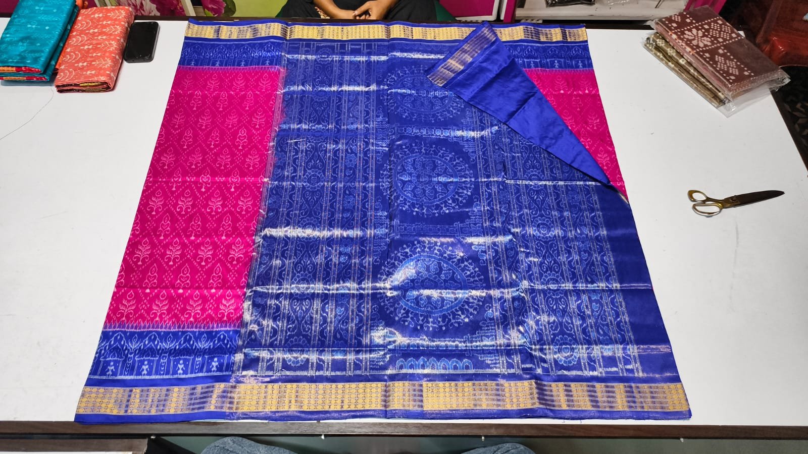 Elegant royal blue body with rich pink contrast pallu, giving a vibrant ethnic look